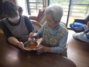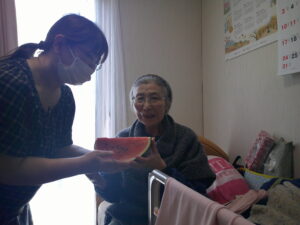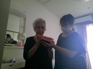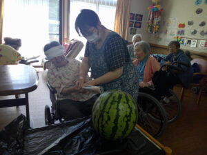 なんてん 長嶺荘「夏の行事‼」と日常✨ 2025年8月20日 今月の行事紹介を紹介していきます‼ まずは、すいか割り大会です🍉✨ 昔を思い出され思いっきりすいかをたたき楽しまれていました(^^♪ すいか割りの後はおいしいすいかを皆様で食べました✨ 郷土料理のおくずかけ、おはぎを美味しくいただきました。 料理のお手伝いを楽しくしていただいています! 冷やし中華の錦糸卵になりました‼ 次回の行事は敬老会です‼ なんてん 長嶺荘