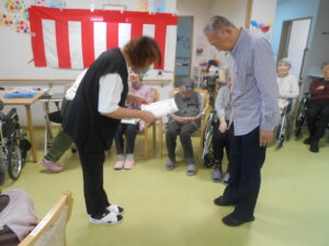 敬老会を行いました。米寿・卒寿祝いの方が7名おりました。お祝いをした後に、皆さんでくじ引き大会へと突入します。ボックスに入っている紙を引いて、一等からハズレまであります。