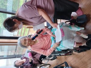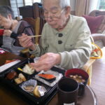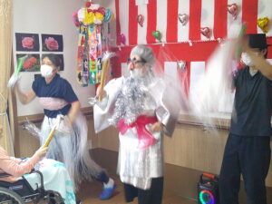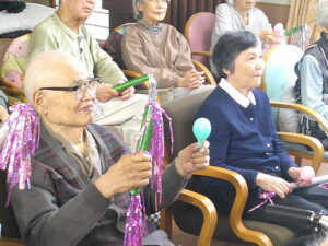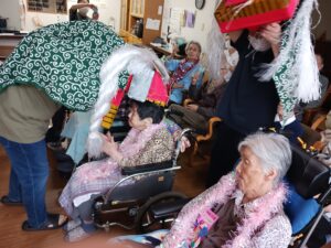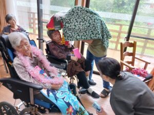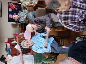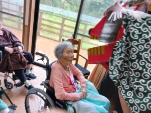 なんてん長嶺荘「敬老会!!」 2025年9月18日 敬老会を18日に行いました✨ 歌を合唱し、クイズ大会、獅子舞、マツケンサンバの出し物を楽しんでいただきました。 敬老会のカードも喜んでいただきました✨ 歌詞カード見ながら合唱を楽しんでいる様子です‼ 獅子舞に噛まれていただきました✨ マツケンサンバを披露しました✨ すごく喜んでいただき、笑っていただきました☺ お膳をおいしくいただきました。 なんてん 長嶺荘